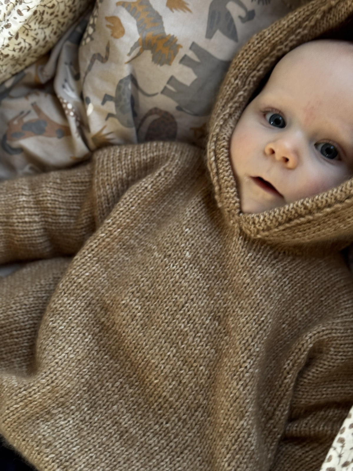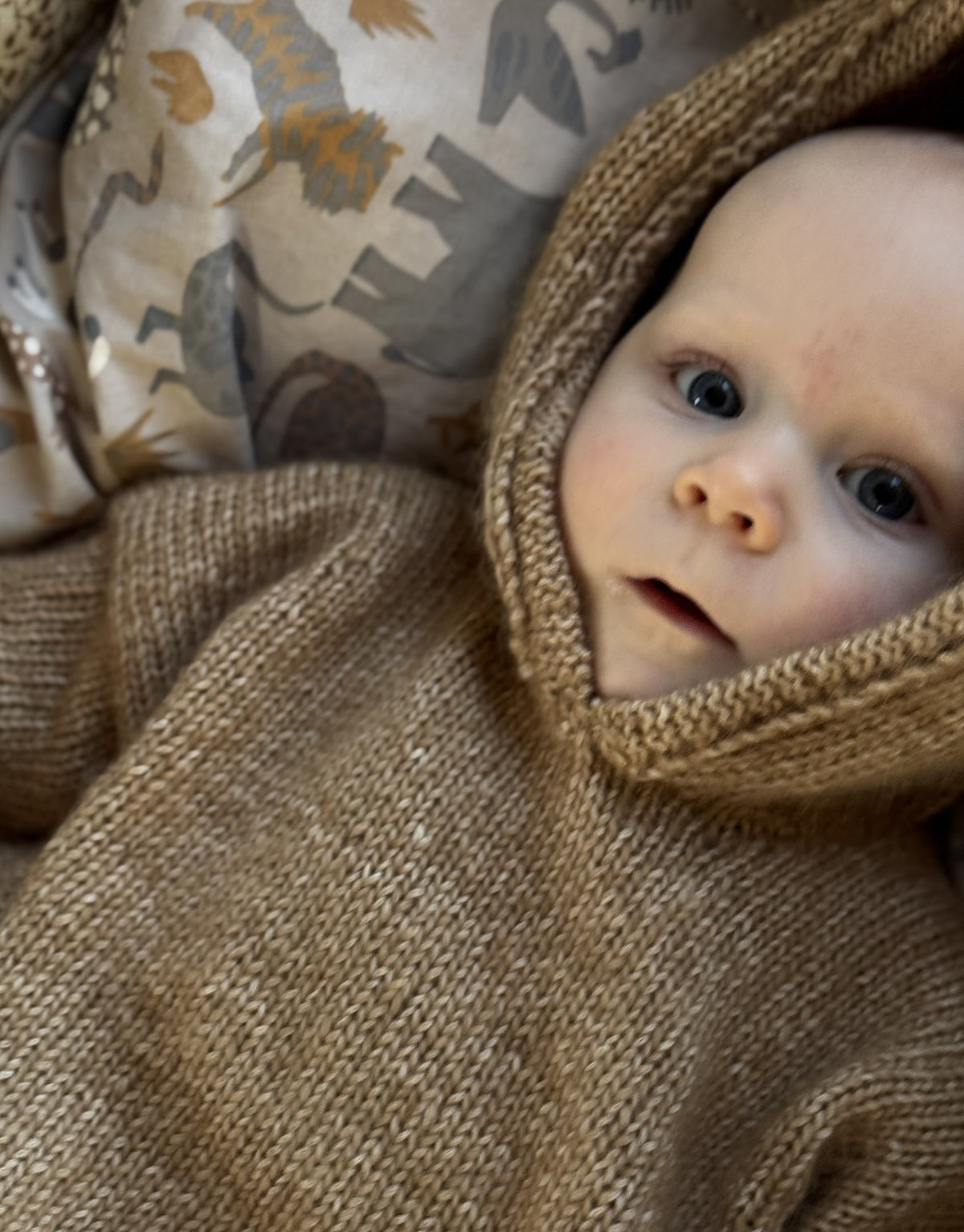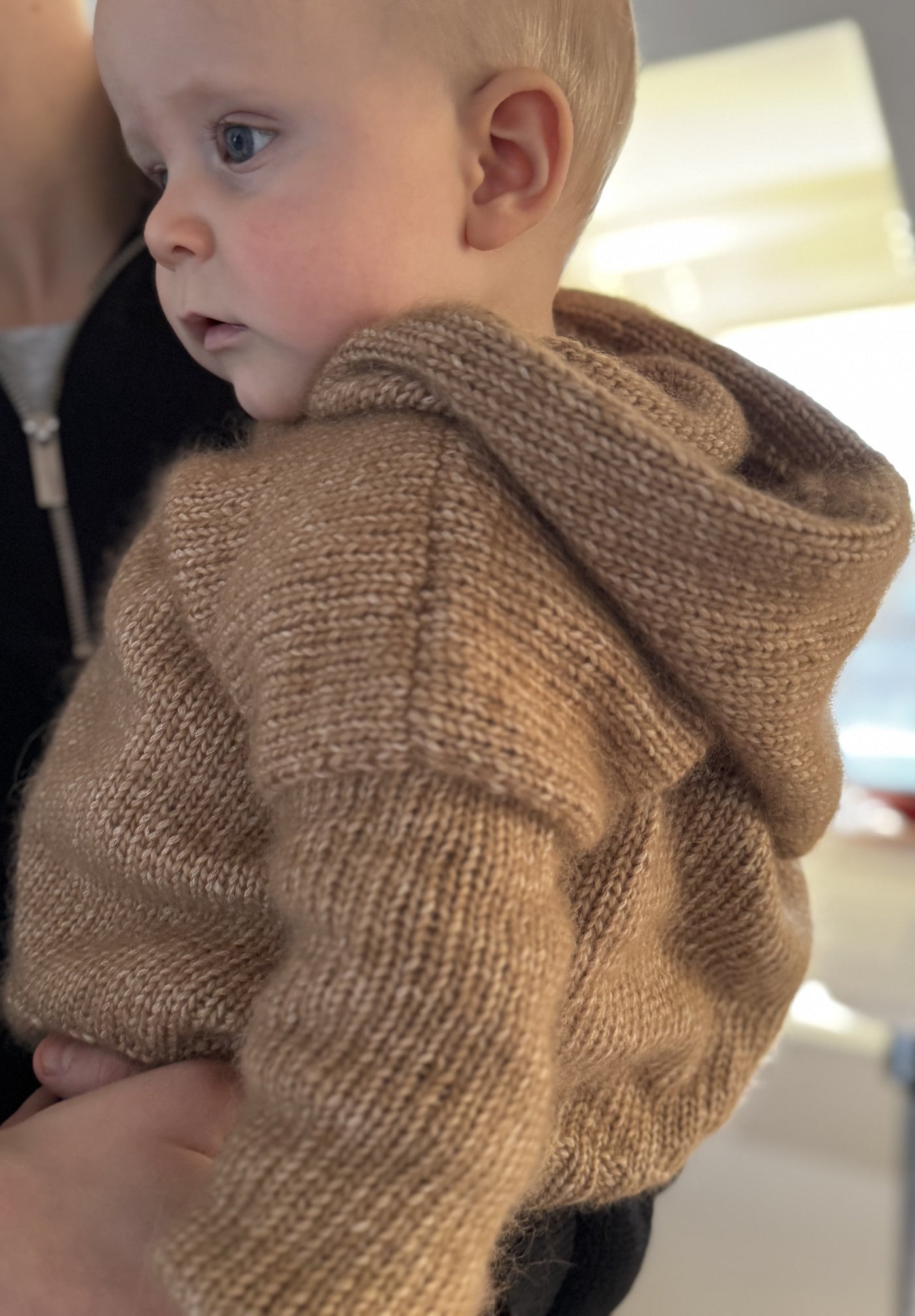 På billedet ser du Isak i "ISAK HÆTTETRØJE" i str 1 -2 år strikket i farven "KARAMEL".