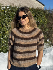 På billedet ser du Kamilla i "Begynder Mokka" strikket i "MØRK CAMEL, CHOKOLADE OG MIX KAKI". Sweateren er strikket i størrelse "XS".