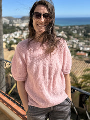På billedet ser du Jael i "Begynder sweater Anemone" strikket i SUPERFIN ALPACA i farven "LYSERØD". Sweateren er strikket i størrelse "S"