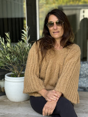 In the picture you see Kamilla in "Beginner Favorite" knitted in SURI ALPACA MERINOULD in the color PETROLEUM BLUE. The sweater is knitted in size "XS/S"