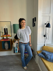 In the picture you see Sara in "Beginner Ocean No2" knitted in SURI ALPACA & MERINO WOOL in the colors SNOW WHITE and SKY BLUE. The sweater is knitted in size "S"