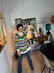 In the picture you see Sara in "Fantasy High Neck" knitted in the base color SNOW WHITE and the shade MULTI VARIETIES. The sweater is knitted in size "M".