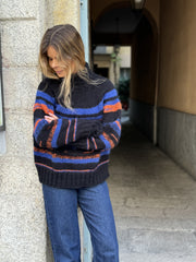 In the picture you see Kamilla in "MOSTERMOSTER #3" knitted in BABYALPACA MERINO WOOL in the colors "COBALT", "COBALT BLUE" AND "DARK ORANGE". The sweater is knitted in size "XS/S"