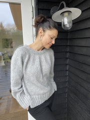 På billedet ser du Sara i "Begynder Sweater A" strikket i BABY ALPACA MERINOULD i farven MUSEGRÅ. Sweateren er strikket i størrelse "M"