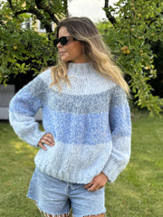 På billedet ser du Kamilla i "Begynder Blue Sky" strikket i SUPERFIN ALPACA i farverne SNEHVID, HIMMELBLÅ, DENIMBLÅ OG PETROLEUM BLÅ. Sweateren er strikket i størrelse "S"