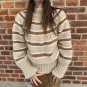 På billedet ser du Jael i "Begynder Cappuccino" strikket i BABY ALPACA MERINOULD i farverne CREME, CAPPUCCINO OG HVID. Sweateren er strikket i størrelse "S".