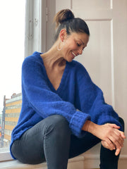 Rebekka V Genseren strikkes ovenfra og ned, så du trenger sy den sammen til slutt. Genseren er oversize og med ekstra lang bol og lange armer med dobbel ribbkant. Genseren er ekstra lang i bakstykket ettersom det ikke skal strikkes vendepinner bak i halsen. Armene er strikket på med raglanøkning.