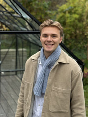 På billedet ser du Jonathan i "MOSTERMOSTER SNUGGLE WRAP" strikket i BABYALPACA MERINOULD i farven "LYSEBLÅ" og Thomas i farven "MØRK KOKSGRÅ"